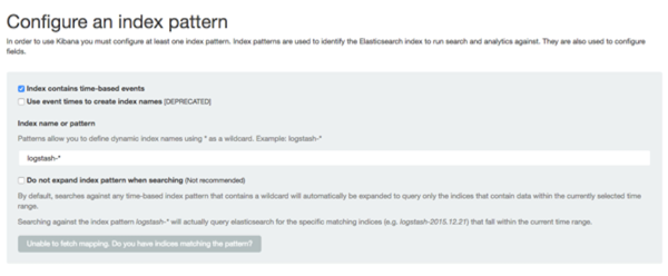 Kibana displays the Configure an index pattern window. Use the index pattern window to identify your telemetry source.