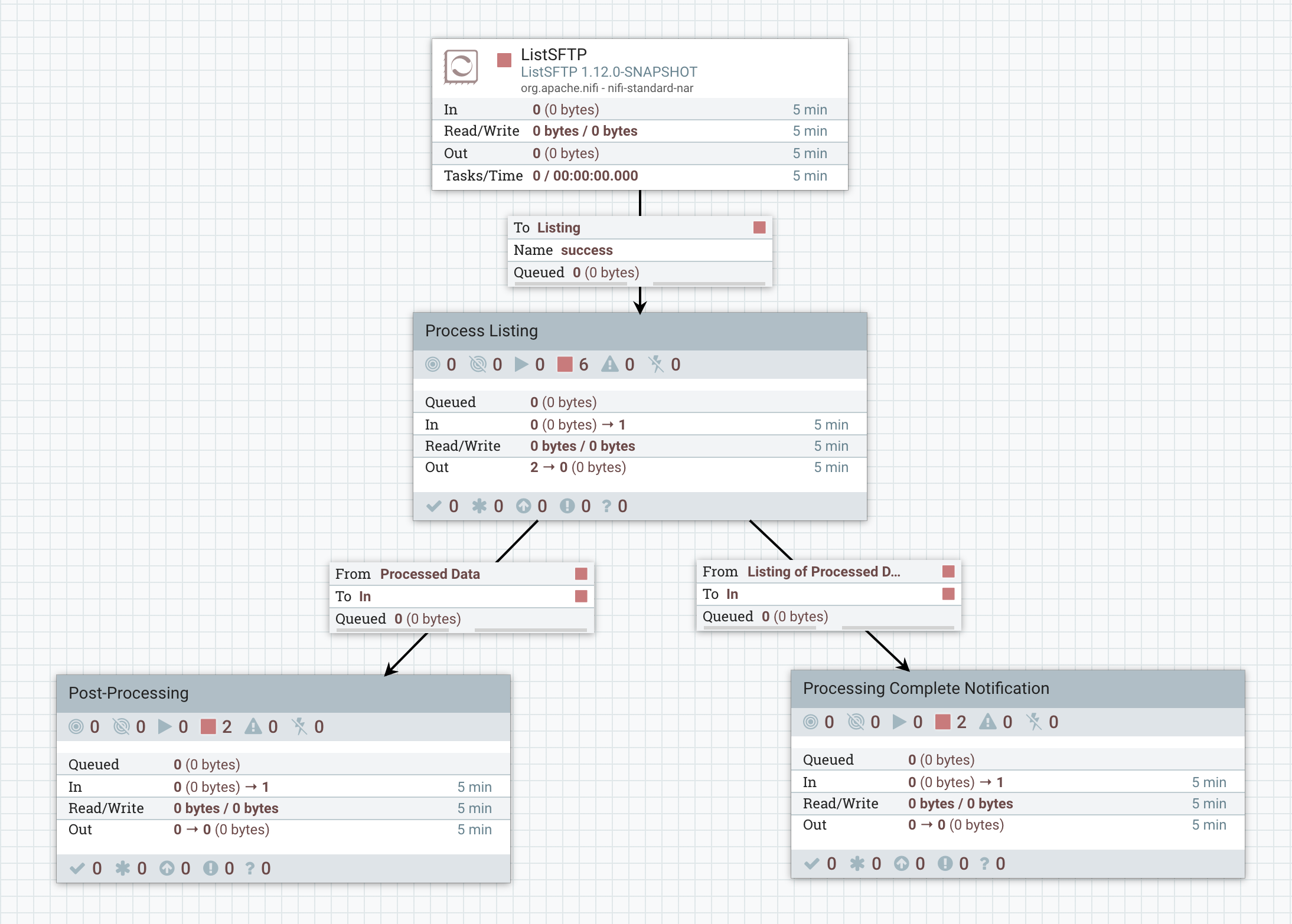 In this flow, we perform a listing of a directory with ListSFTP. The processor is configured with a Record Writer (in this case a CSV Writer, but any Record Writer can be used) so that only a single FlowFile is generated for the entire listing. That listing is then sent to the "Process Listing" Process Group (shown below). Only after the contents of the entire directory have been processed will data leave the "Process Listing" Process Group. At that point, when all data in the Process Group is ready to leave, each of the processed files will be sent to the "Post-Processing" Process Group. At the same time, the original listing is to be sent to the "Processing Complete Notification" Process Group. In order to accomplish this, the Process Group must be configured with a FlowFile Concurrency of "Single FlowFile per Node" and an Outbound Policy of "Batch Output."