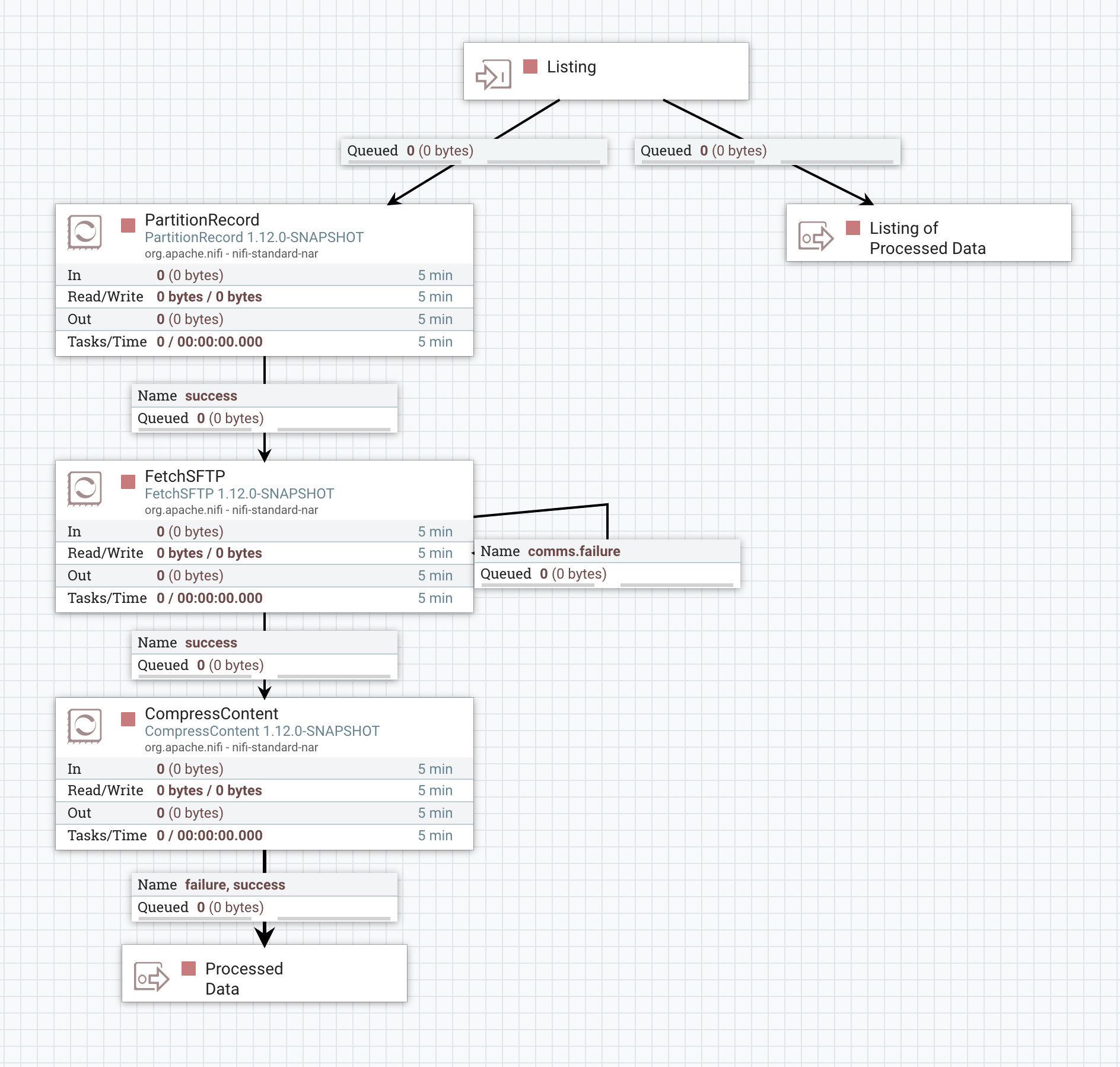 Finally, we process the data - in this example, simply by compressing it with GZIP compression - and send the output to the "Processed Data" Output Port. The data will queue up here until all data is ready to leave the Process Group and then will be released.