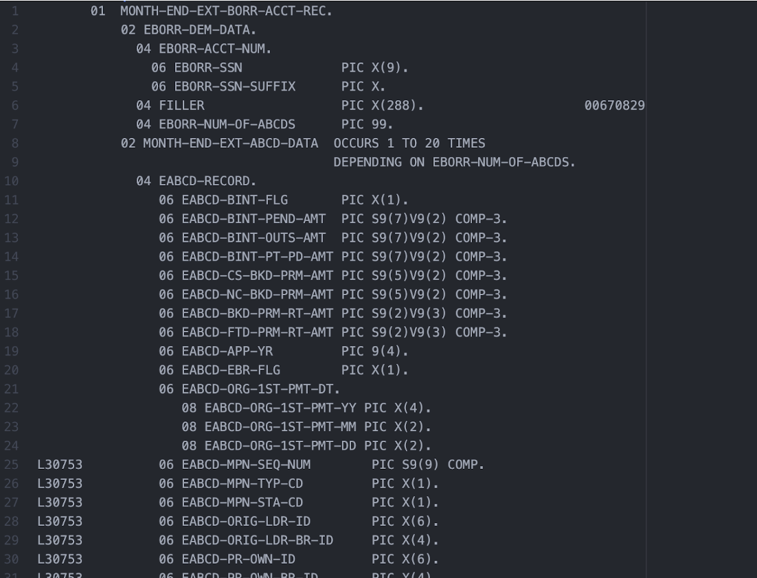 Example COBOL copybook file structure: