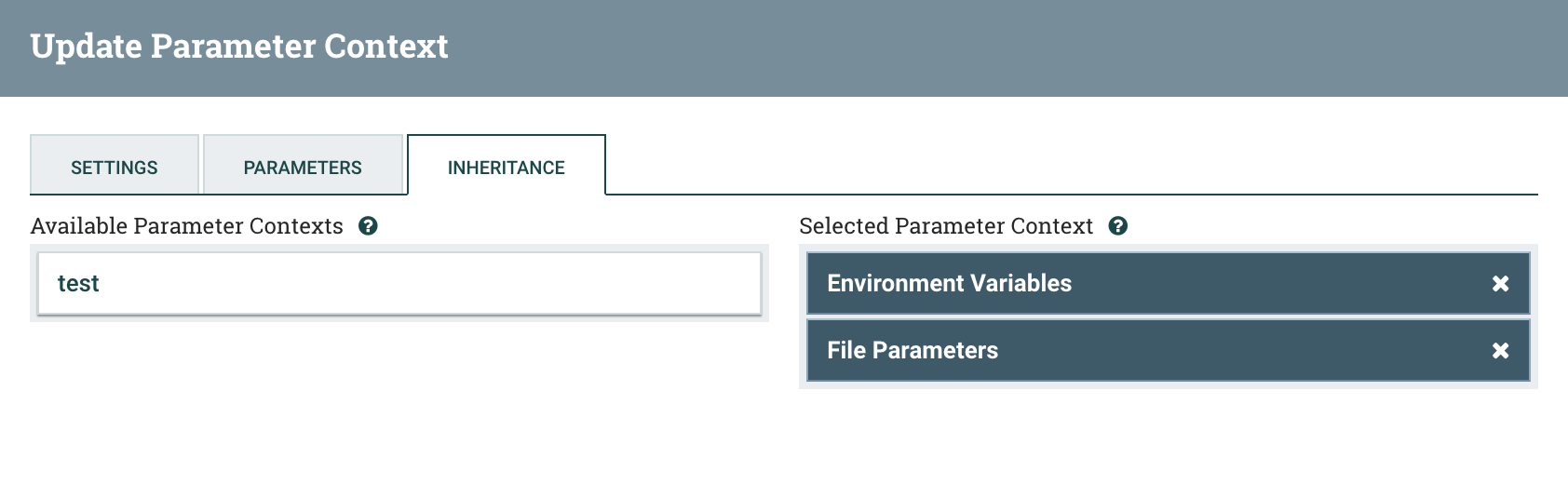 It is good practice to create separate Parameter Providers for different sources, and then compose the Parameter Contexts through inheritance. This allows sensitive parameters to originate from a secrets manager, like HashiCorp Vault, and non-sensitive parameters to originate from other sources like Environment Variables or the file system. In the following simple example, the EnvironmentVariableParameterProvider contains non-sensitive Parameters and the FileParameterProvider contains sensitive Parameters. Both Parameter Providers are added as inherited contexts to a new Parameter Context, “Parameters”. For details on inherited Parameter Contexts, see What is Parameter Context inheritance?.
