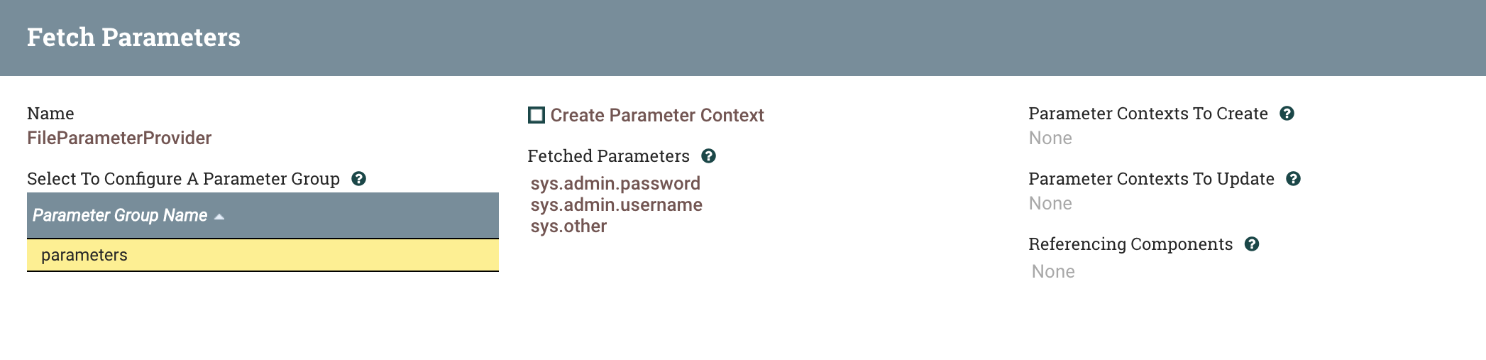 sys.other are displayed.You can now move on to Creating a Parameter Context from a Parameter