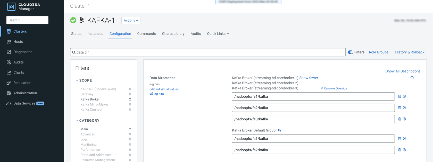 Kafka data directories are configured. The Kafka service now uses all volumes