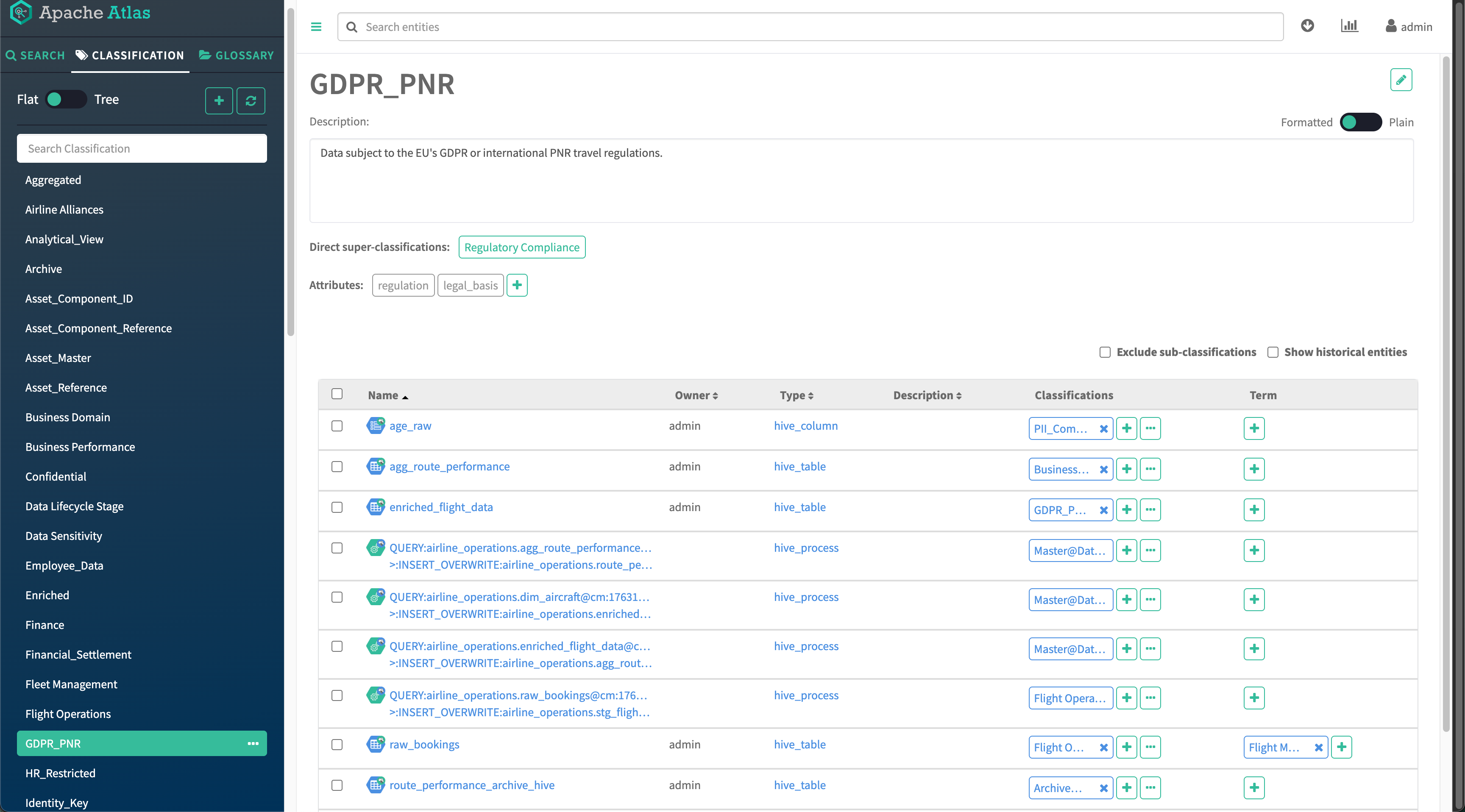 - The Classifications tab shows the classifications associated with this entity (which are also shown in the top section of the detail page). It allows you to add, update, or remove classifications from the entity.