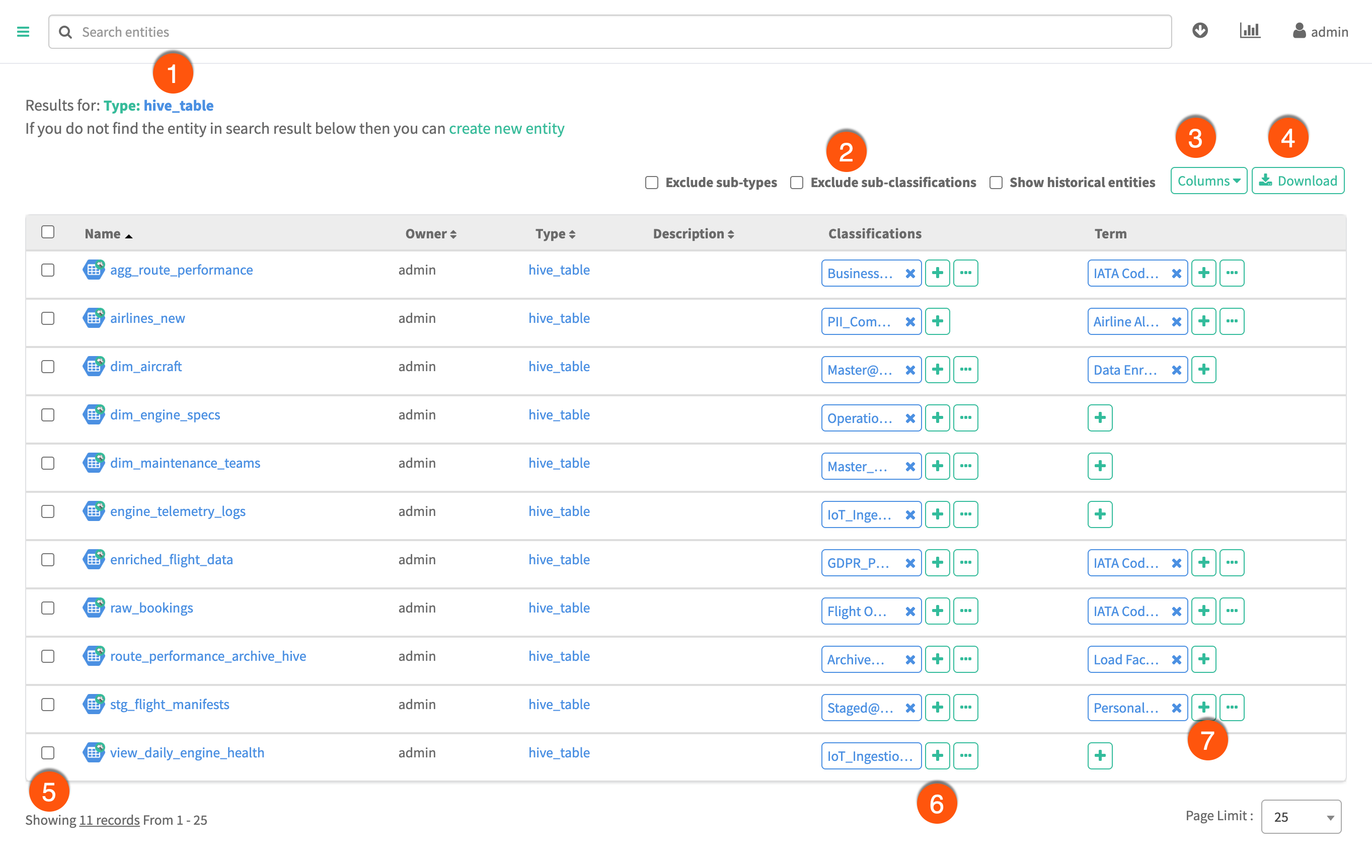 - By selecting the checkboxes, mark multiple entities for export or for applying classifications or terms.