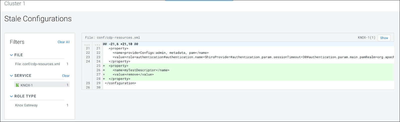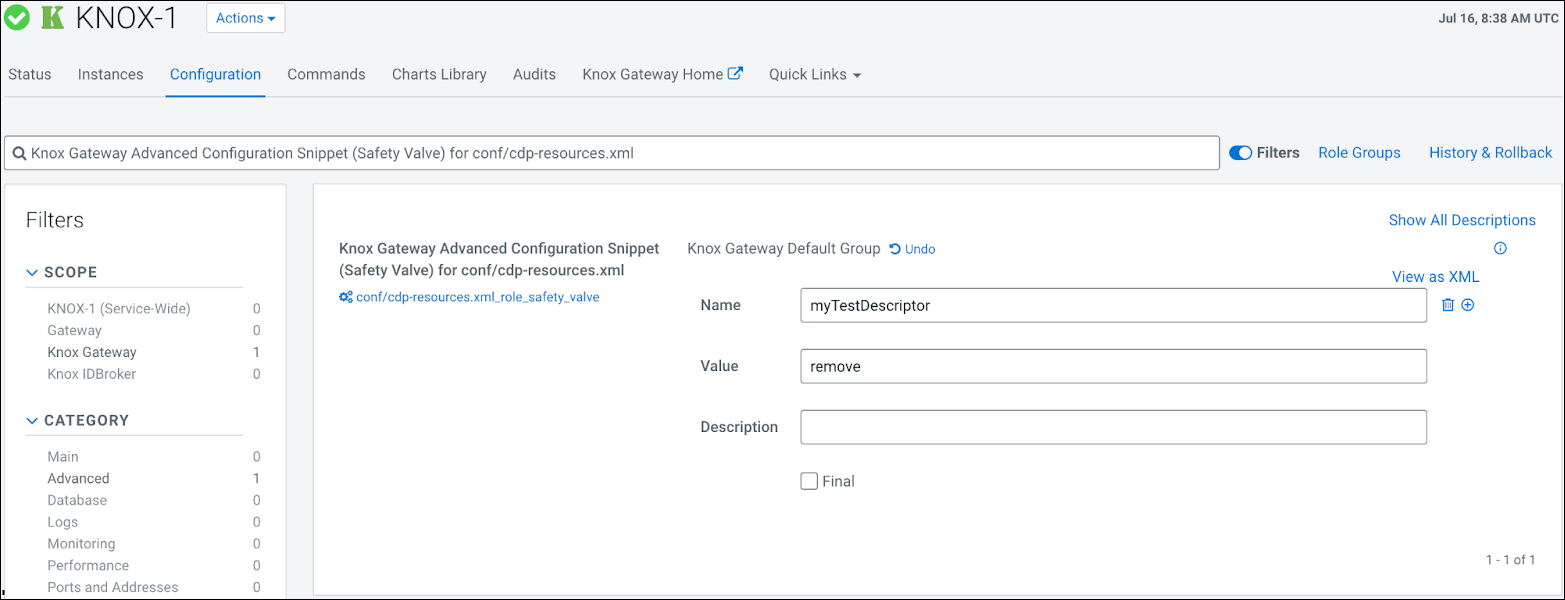 - Find the Knox Gateway Advanced Configuration Snippet (Safety Valve) for conf/cdp-resources.xml advanced configuration snippet.