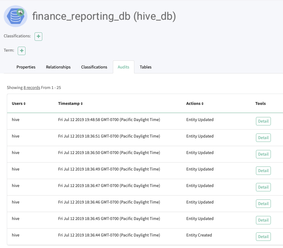 Atlas tracks the lifecycle of each Hive entity, including its creation, update, and deletion. User access and actions that affect the data content of the source asset are not included in the audit.