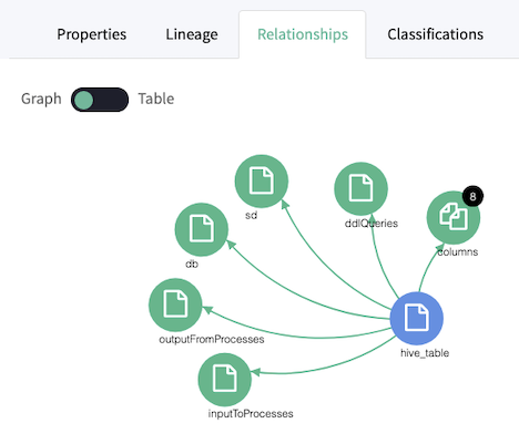 Atlas shows the entities related to this entity in the Relationships tab in the Dashboard.