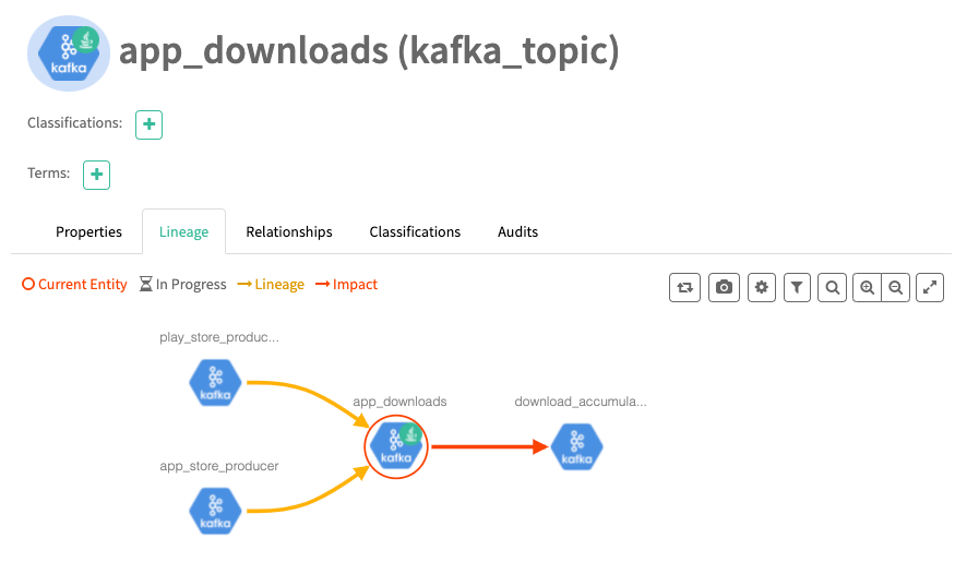 The Atlas lineage graph shows the input and output processes that the current entity participated in, specifically those relationships modeled as “inputToProcesses” and “outputFromProcesses.” Entities are included if they were inputs to processes that lead to the current entity or they are output from processes for which the current entity was an input. Kafka processes follow this pattern.