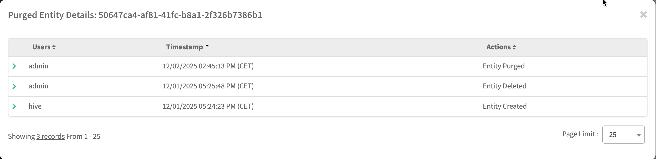 Use the arrow on the left end of the row to show the details of the audit entry.