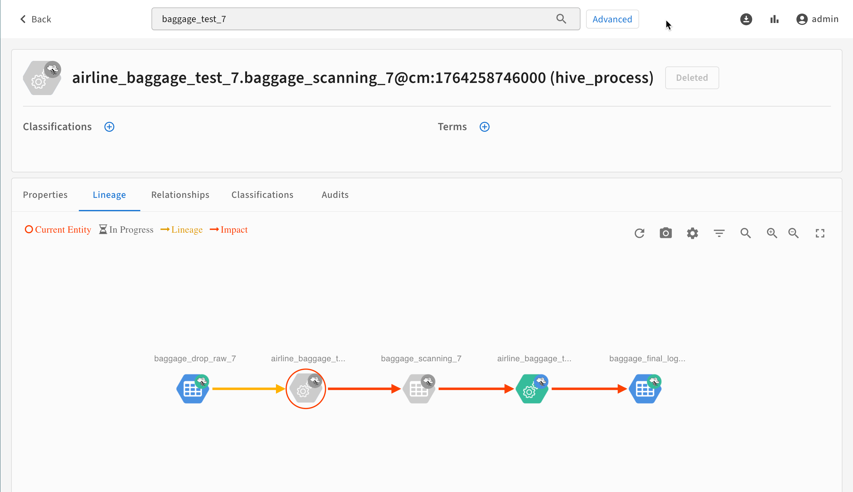 When a data asset is deleted, such as after a DROP TABLE command in Hive, Atlas continues to retain the asset's entity, including metadata, lineage, and audit record. The status of the entity is set to "deleted"; deleted entities show up in search results when the checkbox to Show historical entities is checked. Deleted entities appear in lineage graph dimmed-out.