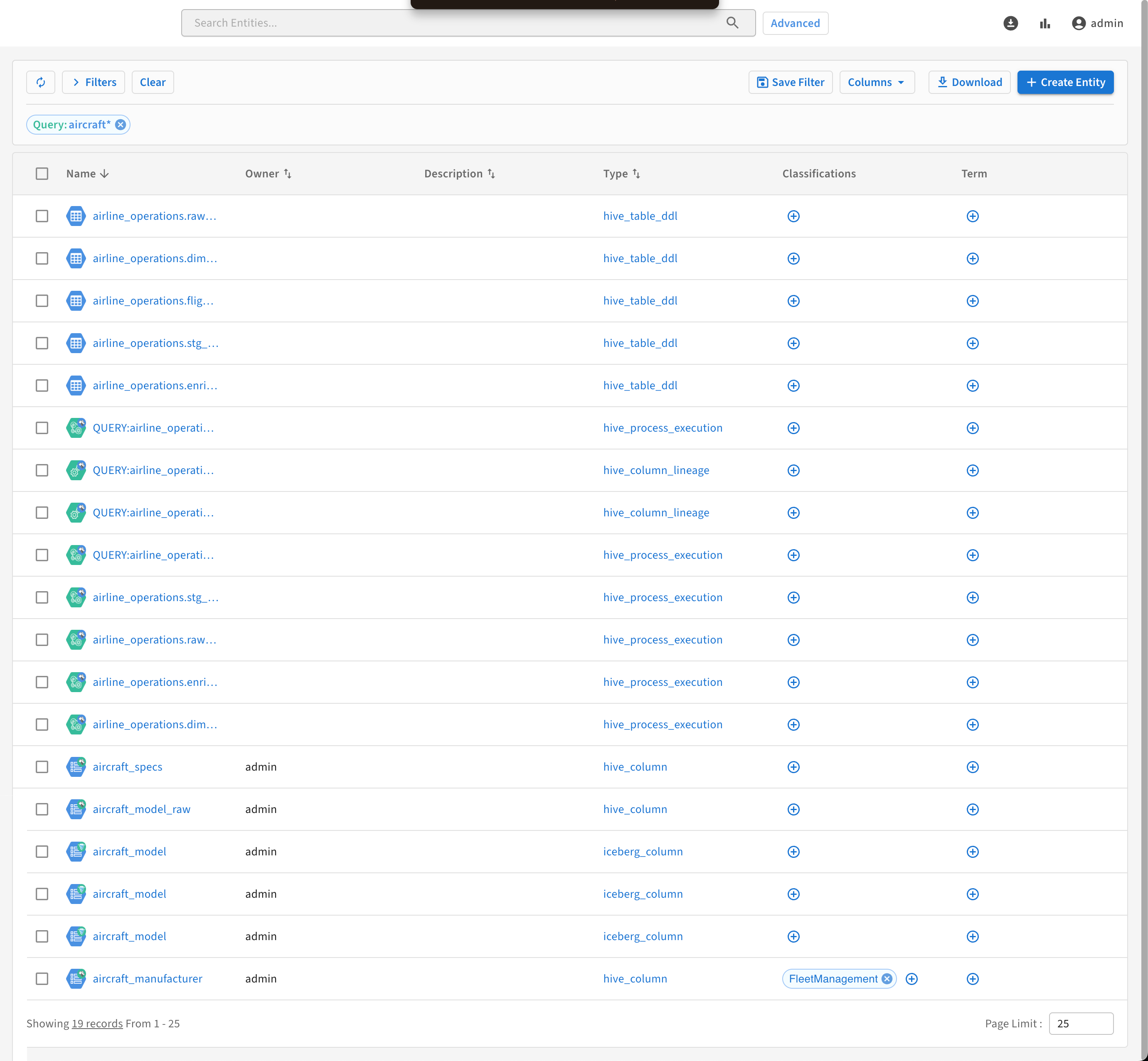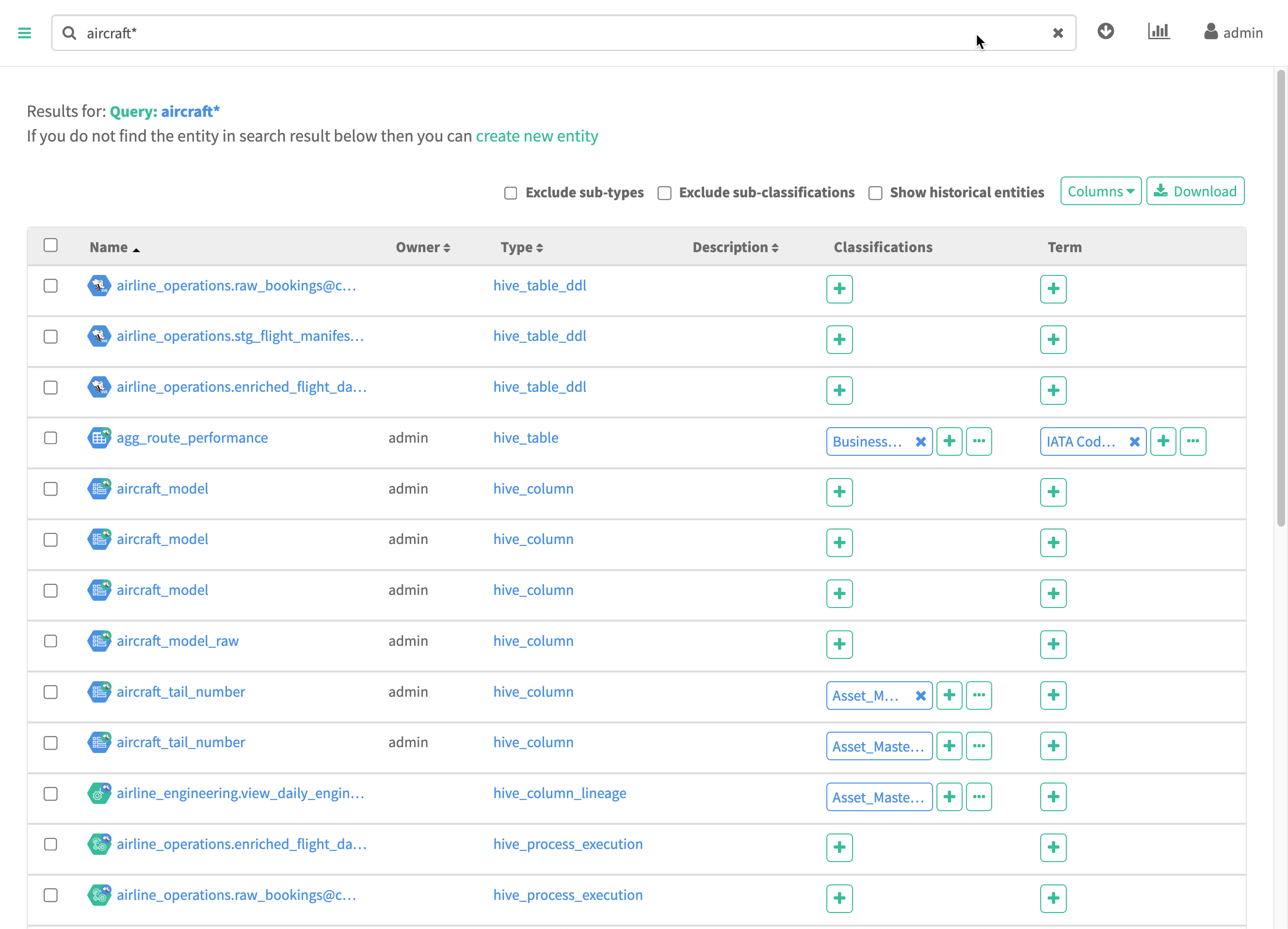 Apache Atlas builds a ranked index of metadata values so you can search for values across all metadata.
