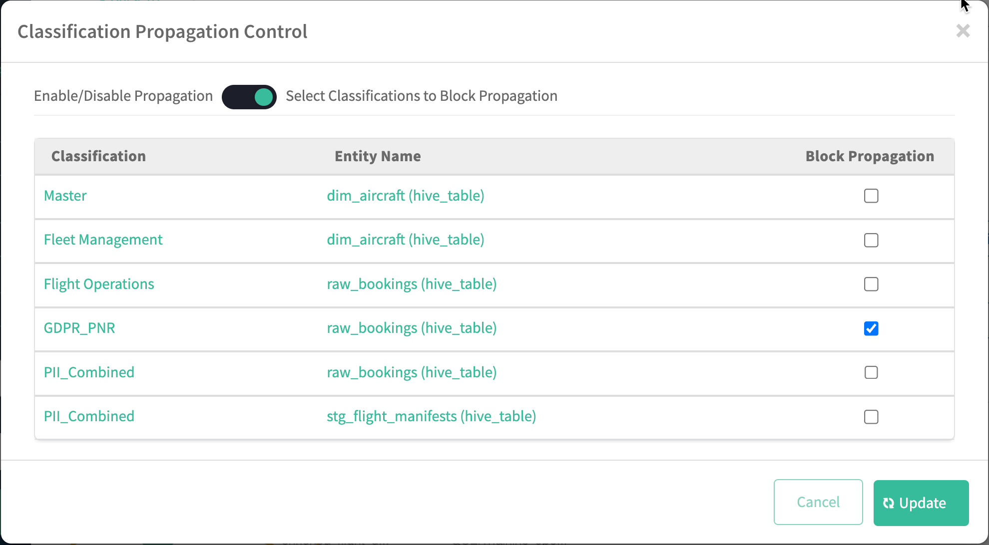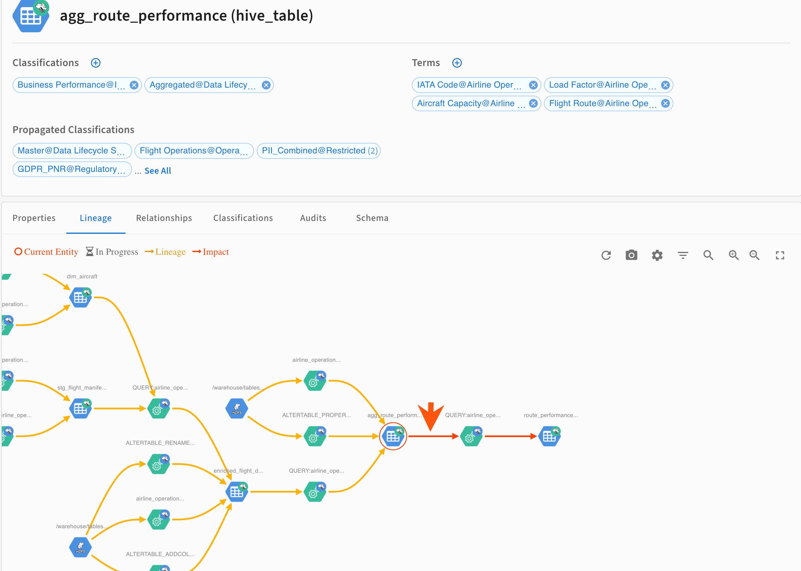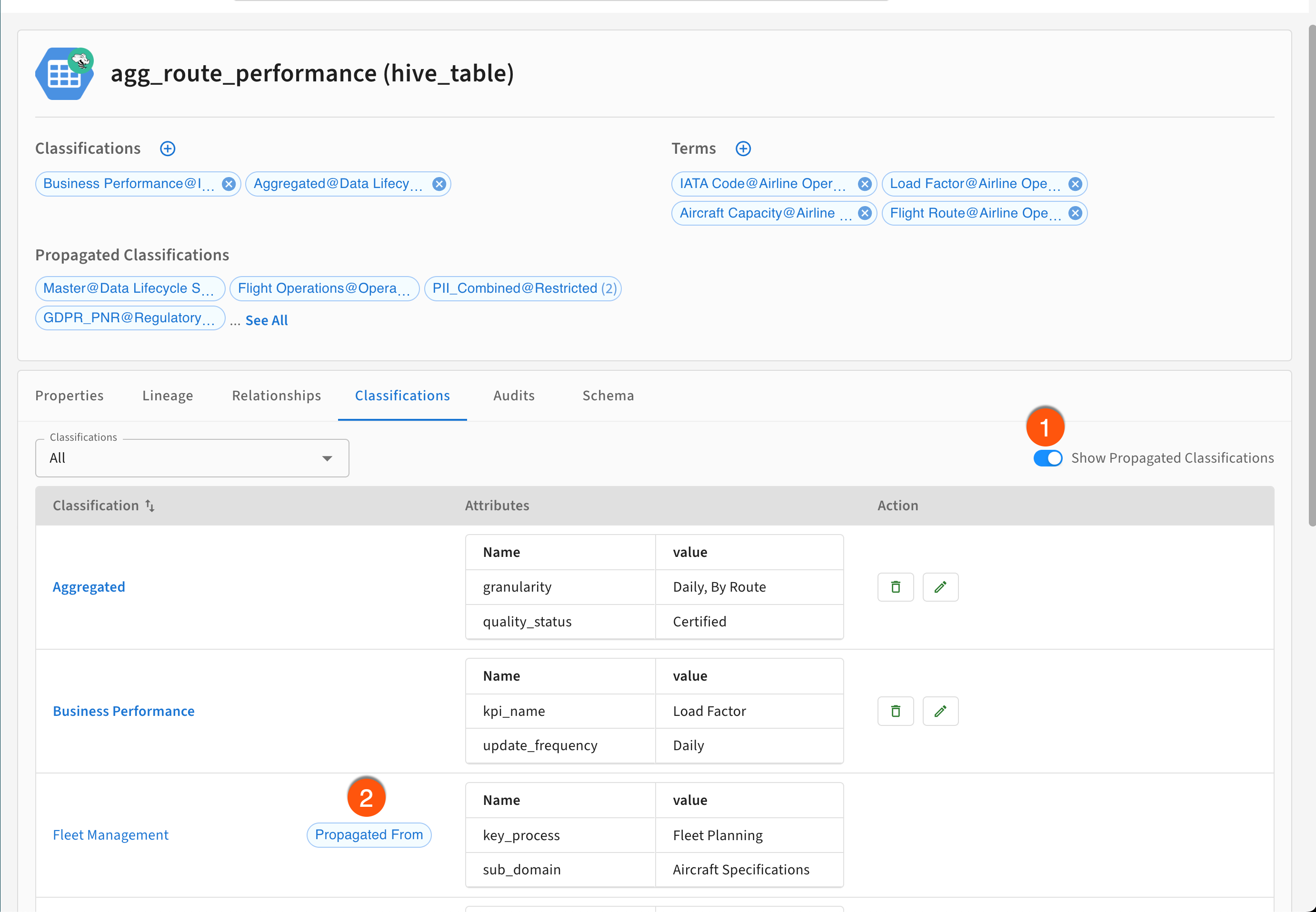When you look at the classifications assign to an entity, you can see which classifications where originally assigned to this entity and which were propagated here through lineage. From the Classifications tab, you can do the following: