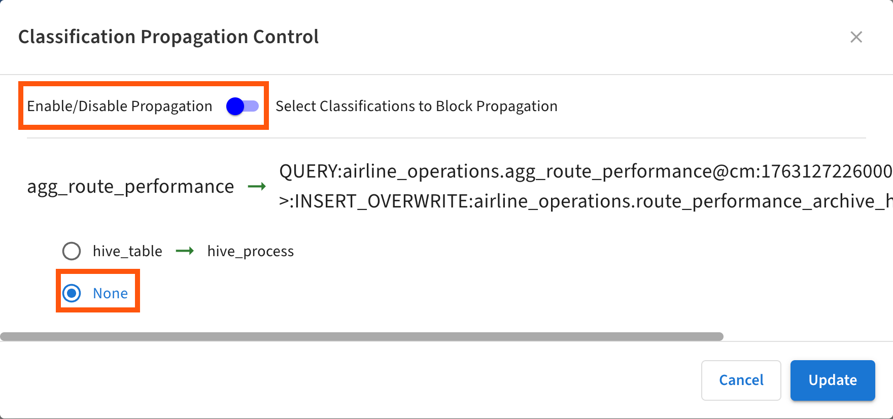 You can turn off the propagation at this point in the lineage. Classifications assigned to the entity will not propagate downstream.
