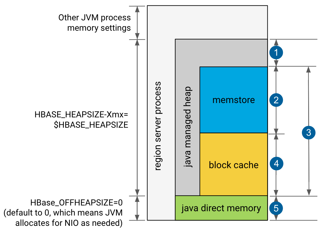 hbase.regionserver.global.memstore.size: default is 0.4, which means 40%hbase.regionserver.global.memstore.size+hfile.block.cache.size≤0.80, which means 80%hfile.block.cache.size: default is 0.4, which means 40%- slack reserved for HDFS SCR/NIO: number of open HFiles *