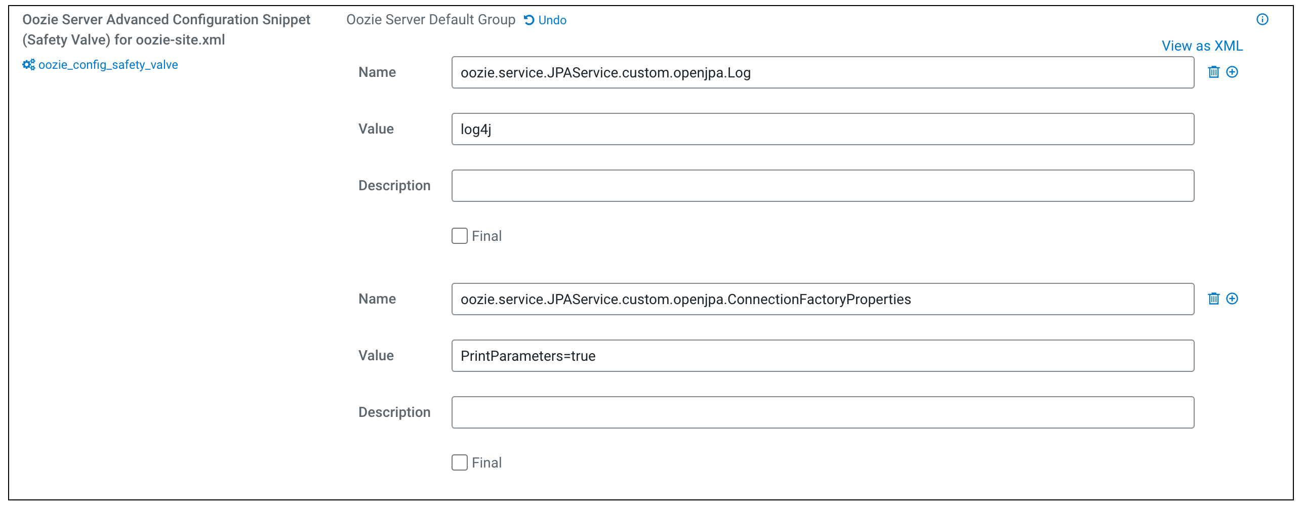 You can configure multiple openjpa.* properties in Oozie Server Advanced Configuration Snippet (Safety Valve) for oozie-site.xml as displayed in the following screenshot.