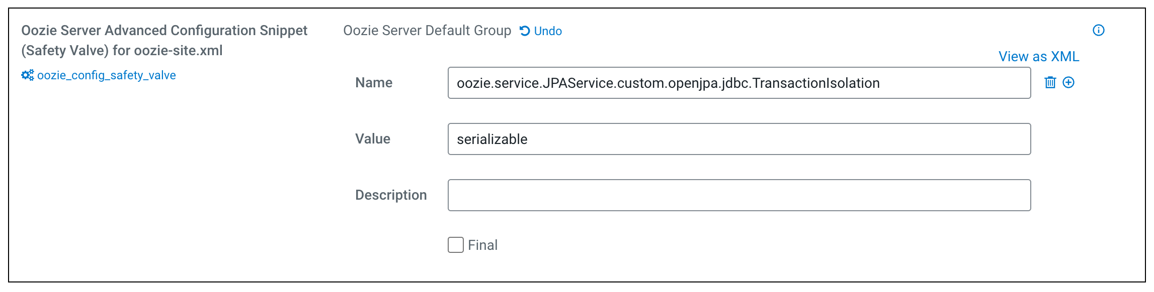 Example on how to override the transaction isolation in Oozie Server Advanced Configuration Snippet (Safety Valve) for oozie-site.xml:oozie.service.JPAService.custom.openjpa.jdbc.TransactionIsolation=serializable