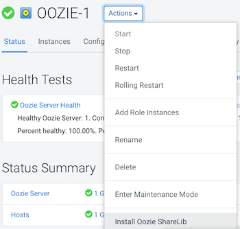 After restarting Oozie, go to Oozie > Actions > Install Oozie ShareLib.