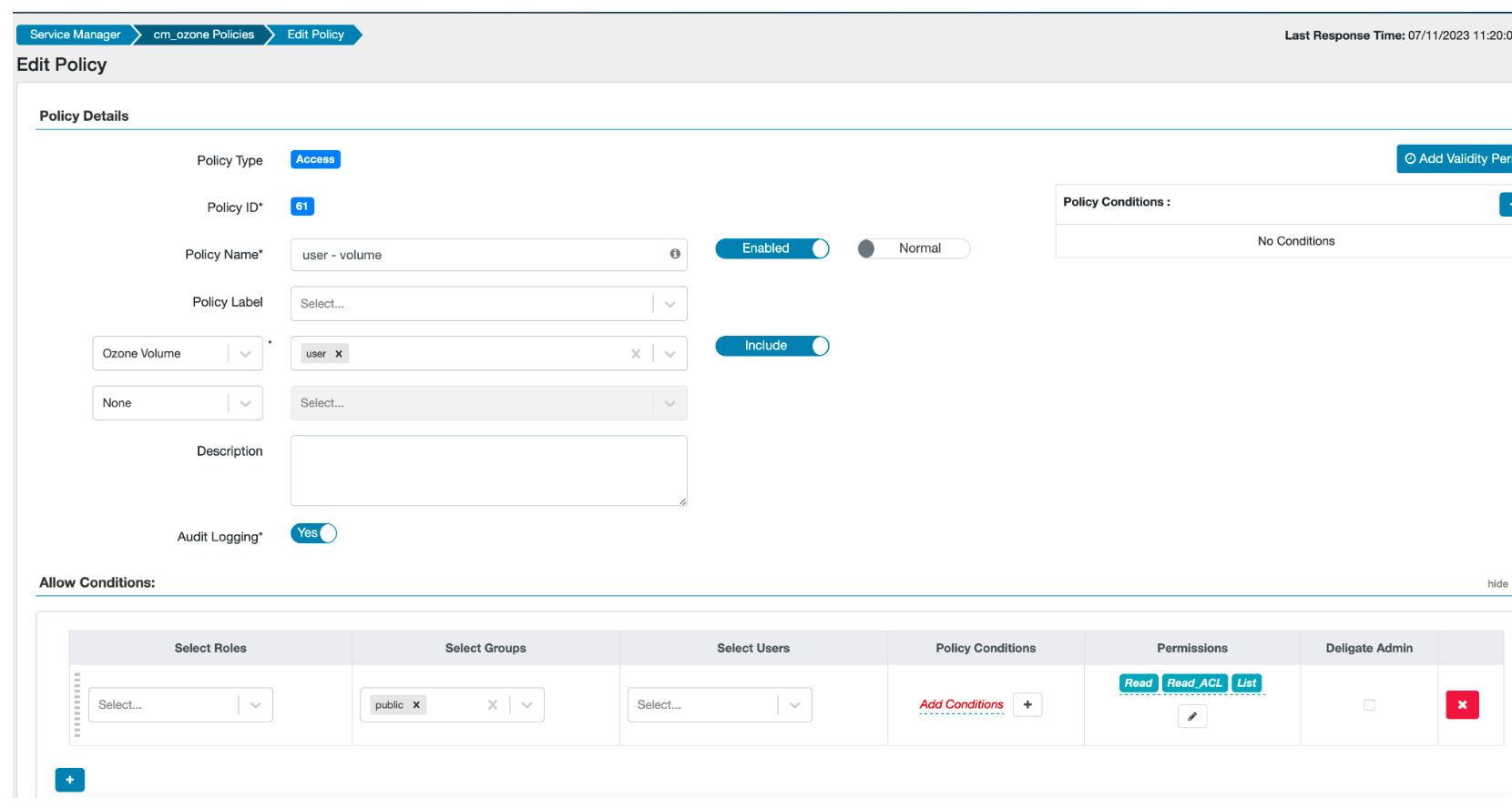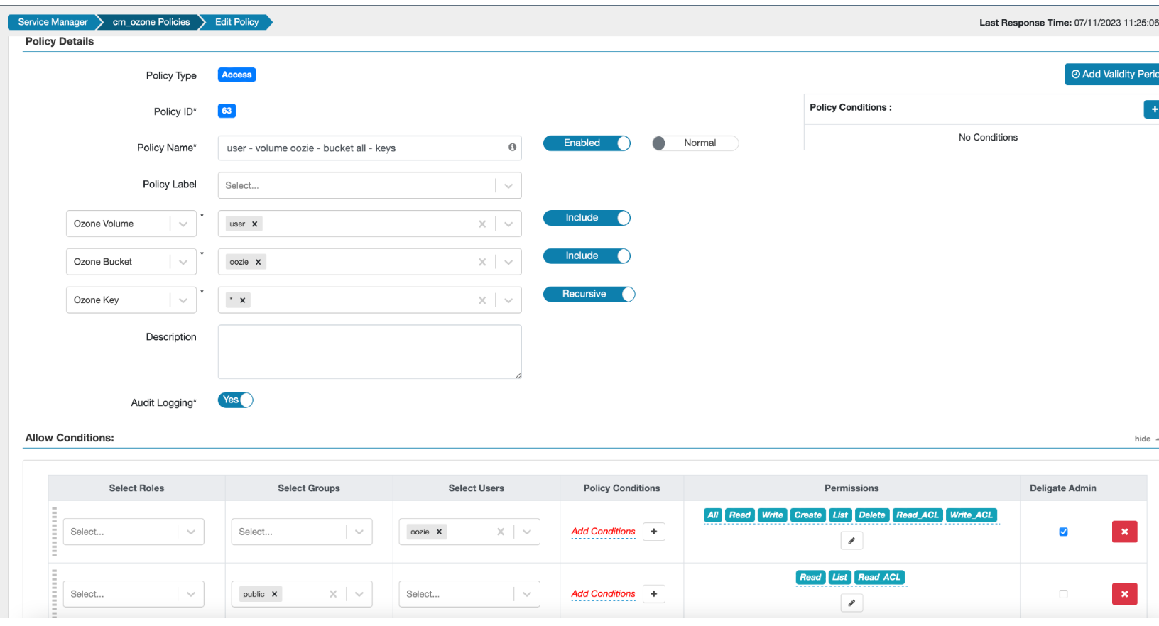 user - volume oozie - bucket all - keys, provide all permissions to theoozieuser, read permissions to all on the/user/ooziebucket, and save the policy.