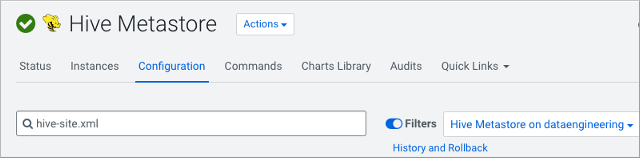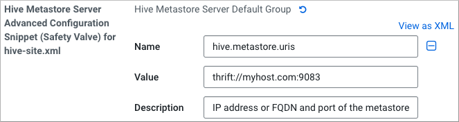 In addition to the database properties you need to set in Cloudera Private Cloud Base, you must configure the metastore URI property. This property defines one or more metastore locations.