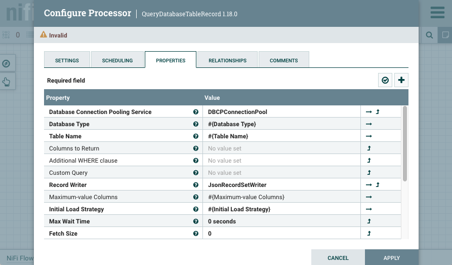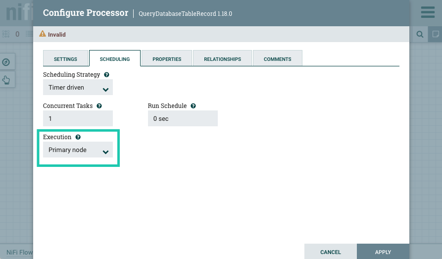 8. Open the configuration of the QueryDatabaseTableRecord processor, and go to the SCHEDULING tab.