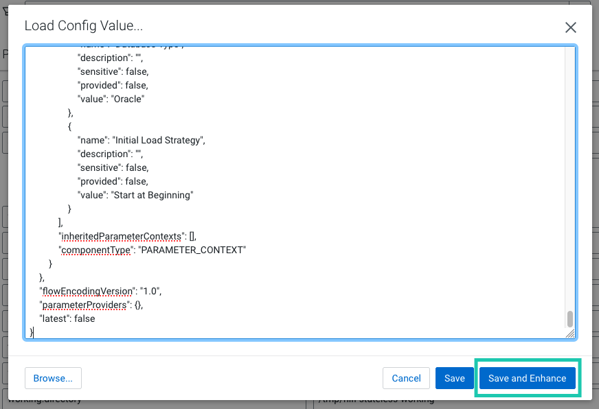 Save and Enhance is a unique Streams Messaging Manager feature only available for this property. If this option is used, Streams Messaging Manager parses the dataflow specified in flow.snapshot, extracts all parameters that are available in the dataflow, and adds them to connector configuration.