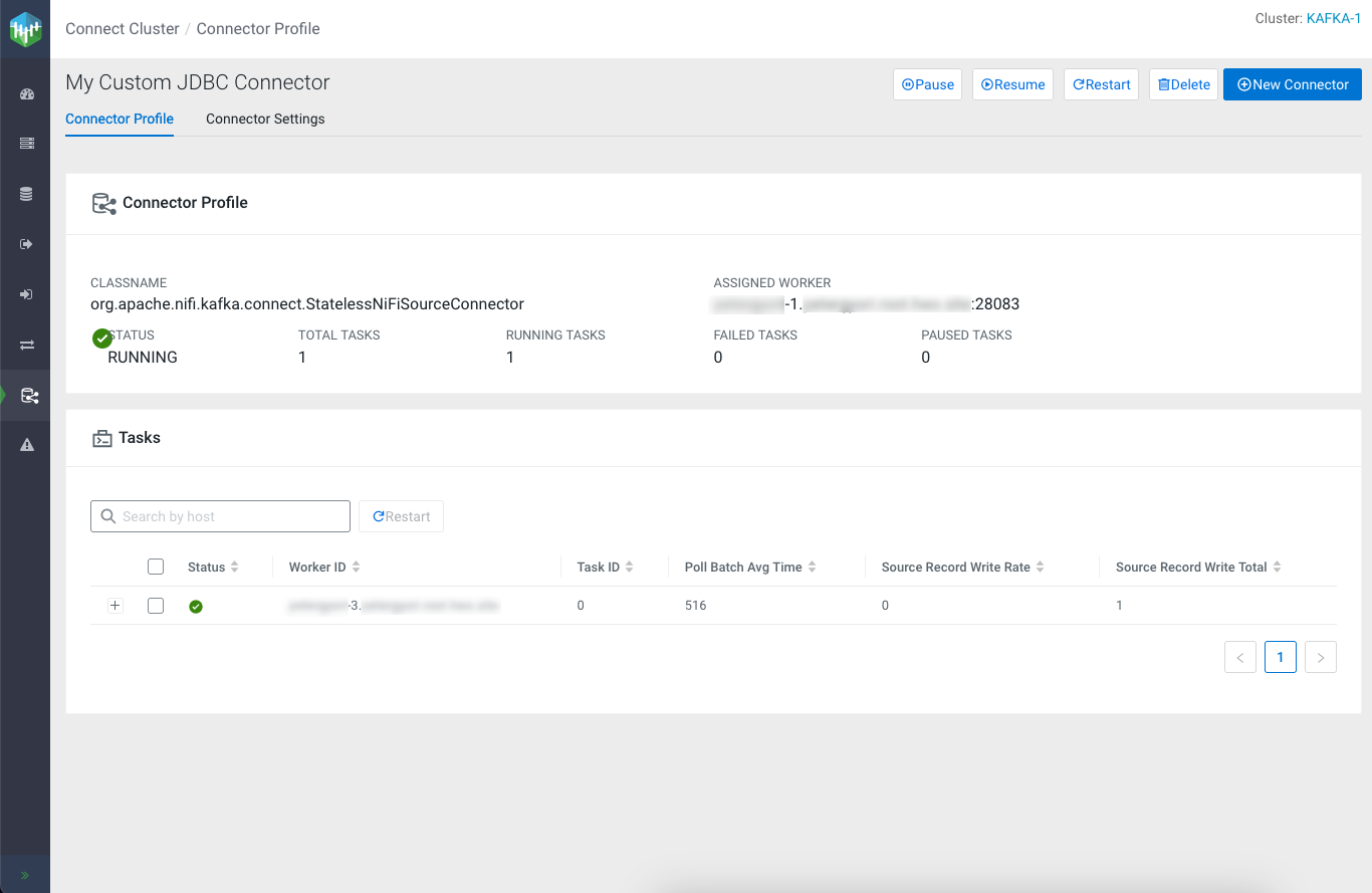 In this particular case, the connector was assigned to the worker running on cluster host 1, whereas the task was assigned to worker running on cluster host 3. This means that dataflow log entries will be present in the Kafka Connect log file on host 3.