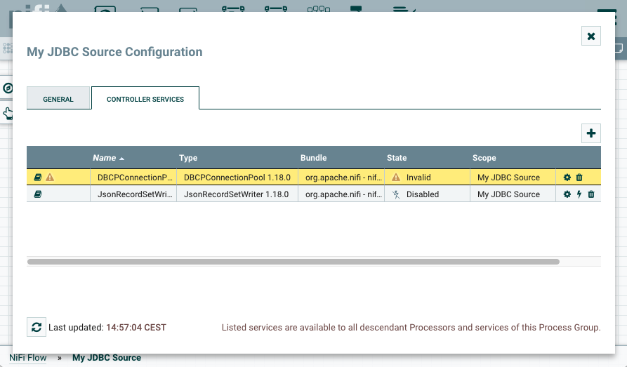 At this point, one controller service is invalid, and the other is disabled, but that is expected. Neither processors, nor controller services need to be valid, started, or enabled at this point.