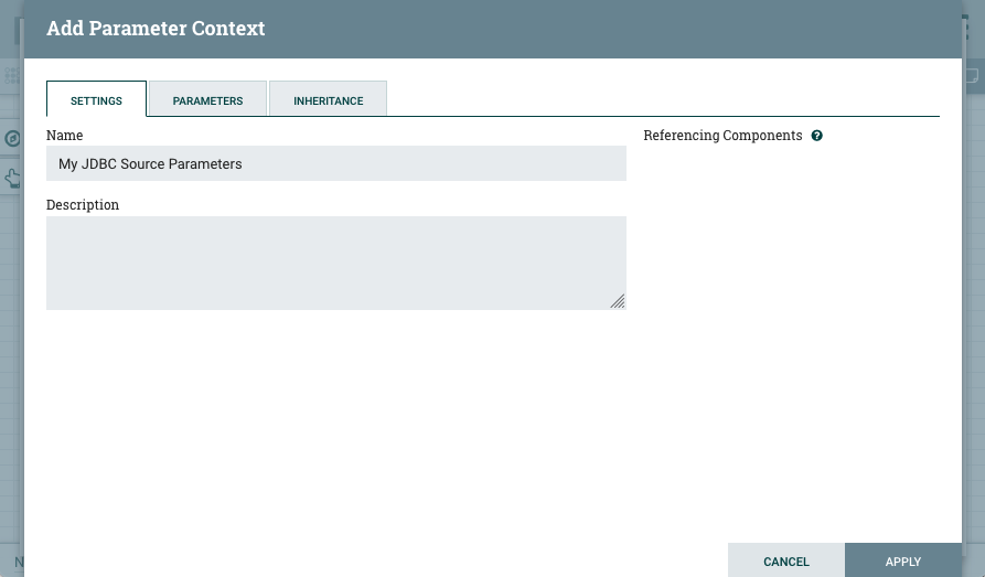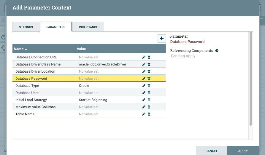 5. Create a parameter context, give it a name, and add the above mentioned parameters to the parameter context.