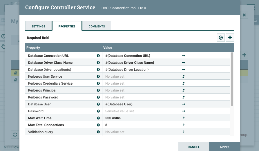 3. Add a DBCPConnectionPool and a JsonRecordSetWriter controller service to the process group.