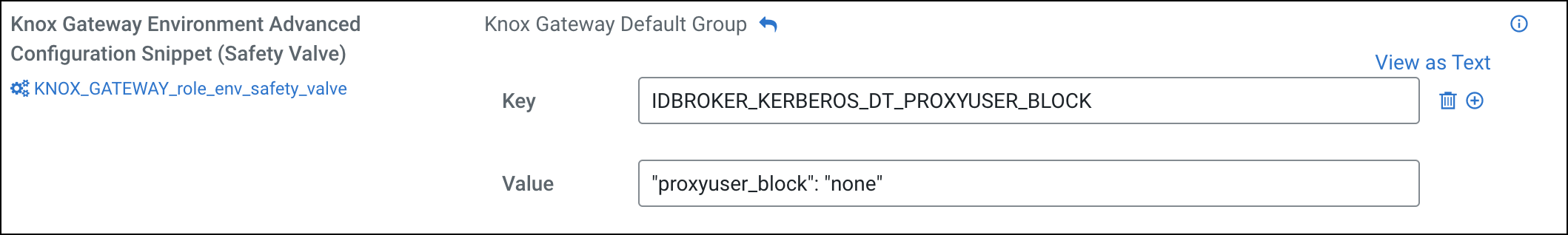 Knox Gateway Environment Advanced Configuration Snippet (Safety Valve):Name = IDBROKER_KERBEROS_DT_PROXYUSER_BLOCK Value = "proxyuser_block": "none"