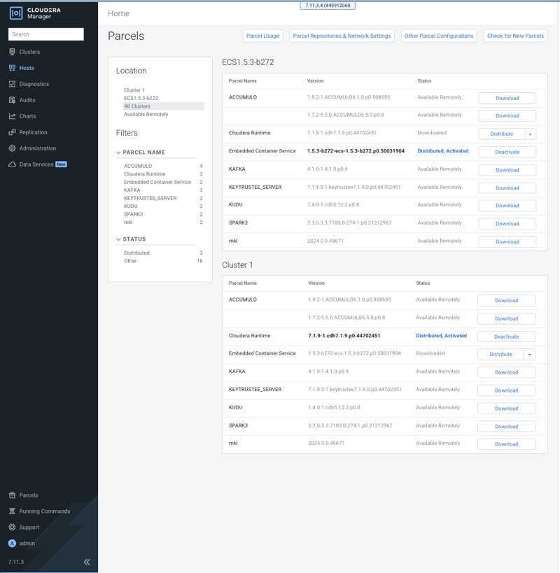 For example, if Cloudera Manager is managing two clusters, the rows in the All Clusters page list the information about the parcels on the two clusters. The Status column displays the current status of the parcels. The Version column displays version information about the parcel. Click the information icon to view the release notes for the parcel. The last column shows actions you can perform on the parcels, such as download, distribute, delete, deactivate, and remove from host.