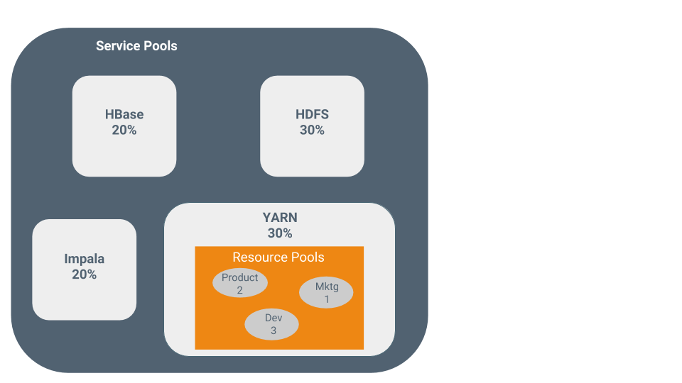 • YARN - YARN manages the virtual cores, memory, running applications, maximum resources for undeclared children (for parent pools), and scheduling policy for each pool. In the preceding diagram, three dynamic resource pools—Dev, Product, and Mktg with weights 3, 2, and 1 respectively—are defined for YARN. If an application starts and is assigned to the Product pool, and other applications are using the Dev and Mktg pools, the Product resource pool receives 30% x 2/6 (or 10%) of the total cluster resources. If no applications are using the Dev and Mktg pools, the YARN Product pool is allocated 30% of the cluster resources.