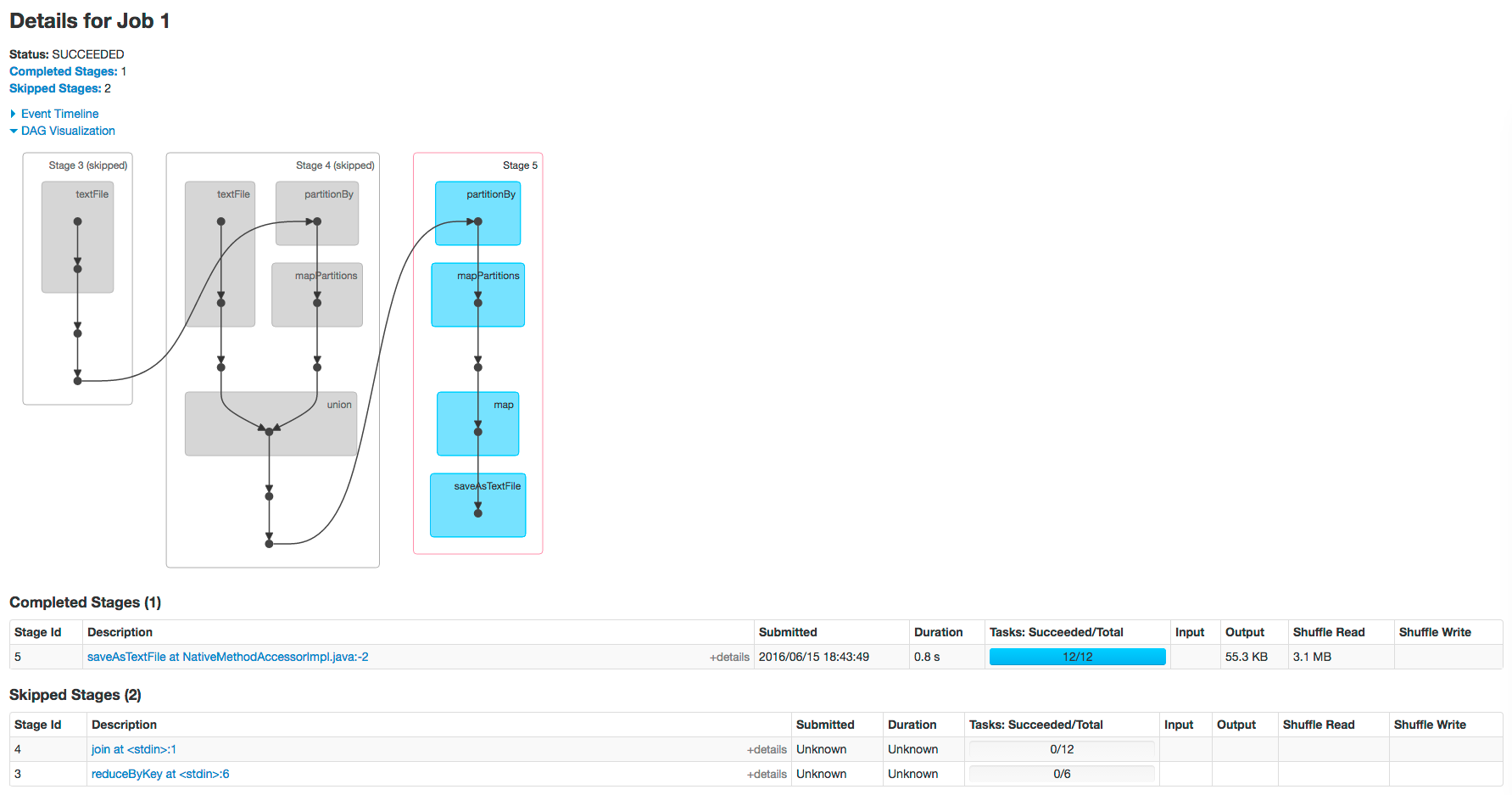 executors. Each job shows the last action, saveAsTextFile, run for the job. The timeline shows that the application