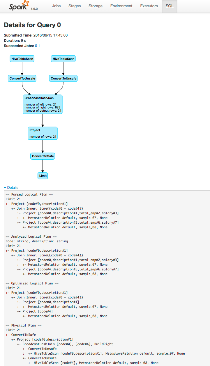 In addition to the screens described above, the web application UI of an application that uses the Spark SQL API also has an SQL tab. Consider an application that loads the contents of two tables into a pair of DataFrames, joins the tables, and then shows the result. After you click the application ID, the SQL tab displays the final action in the query: