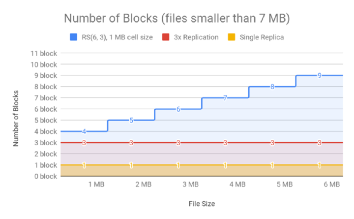For very small files of sizes smaller than the value of data blocks * cell size (in case of RS(6, 3) it is (6 * 1) MB), the number of actual data blocks is less than the data blocks defined by the erasure coding policy, though the number of parity blocks is always the same. For example, in the case of RS(6,3) with a cell size of 1 MB, a 1MB file consists of one data block, rather than six, but it still has three parity blocks. A 1MB file would therefore require four block objects in total. If 3x replication were used, the same file would require only three block objects.