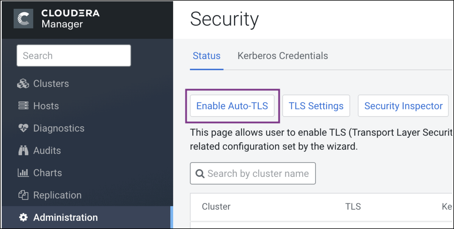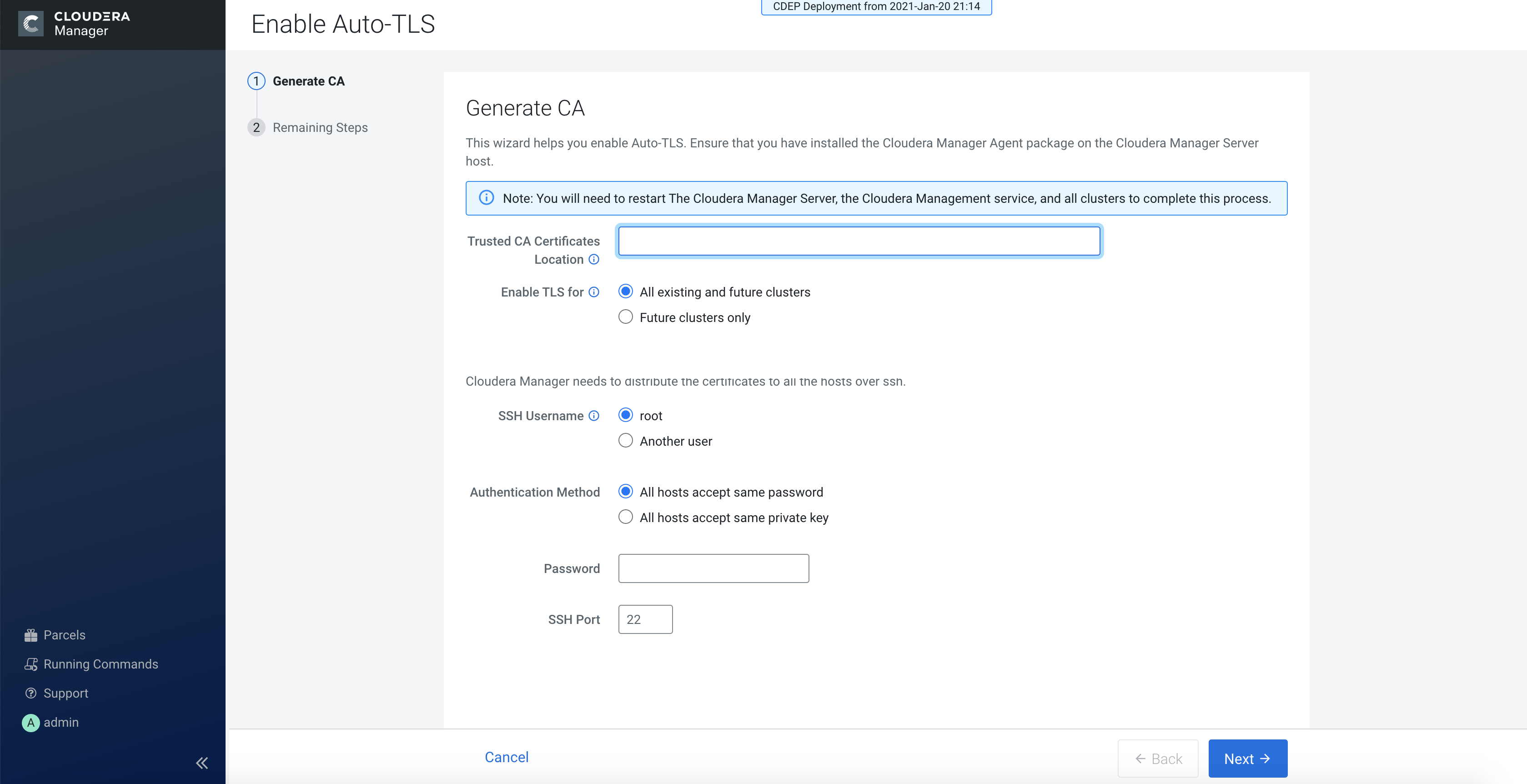 - To choose this option, from Cloudera Manager go to . The Enable Auto-TLS page comes up.