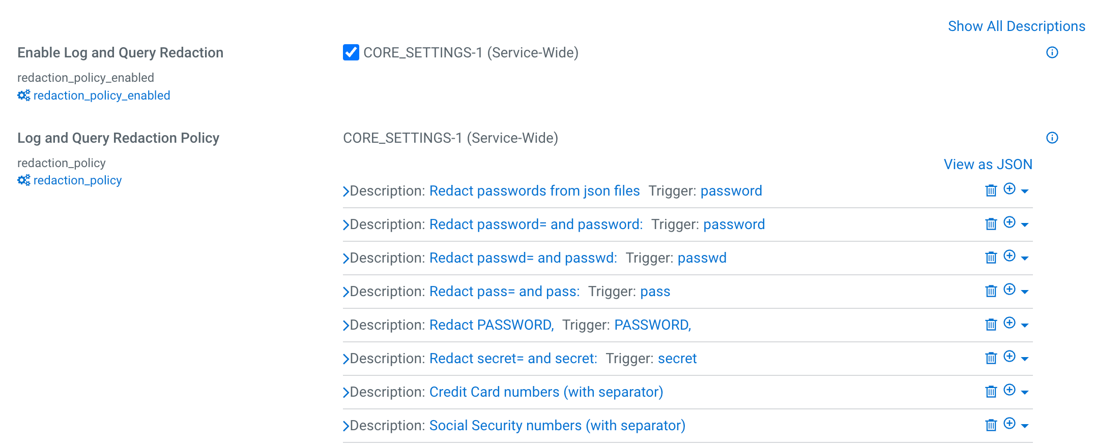 redactionto find the redaction property settings:- Enable Log and Query Redaction