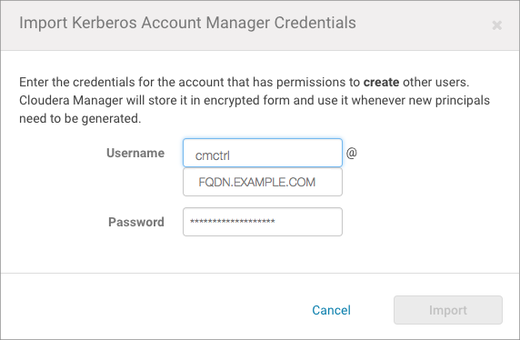 username/admin@YOUR-REALM.EXAMPLE.COM Create the Cloudera Manager Server principal as shown in one of the examples below, appropriate for the location of the Kerberos instance and using the correct REALM name for your setup.
