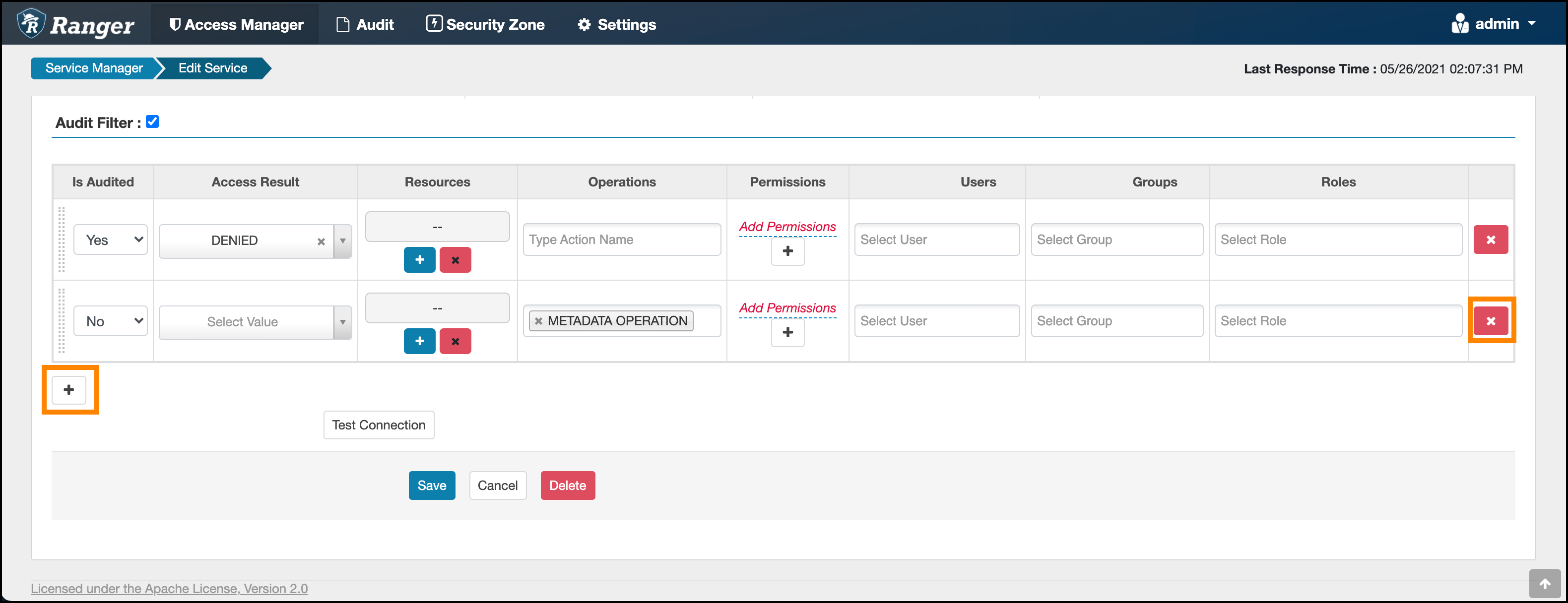 service. For example, the default audit log policy for the Hadoop SQL service appears in Ranger Admin web UI > Service Manager > Edit Service when you scroll down to Audit Filter.
