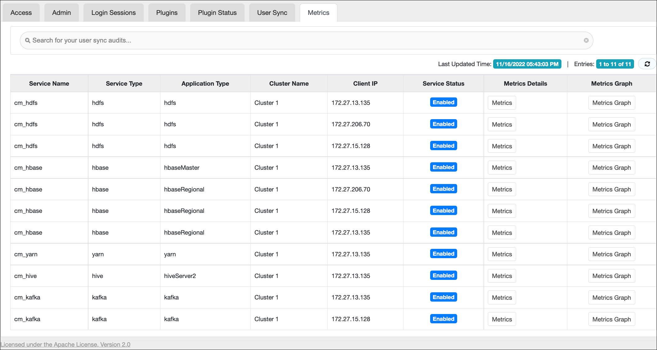 Ranger. Ranger captures audit metrics throughput from the following Ranger