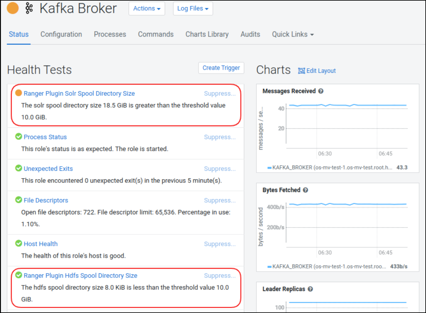These spool alert details appear on the Ranger plugin service Role status page in the Cloudera Manager UI, as shown for Kafka Broker role in the following example: