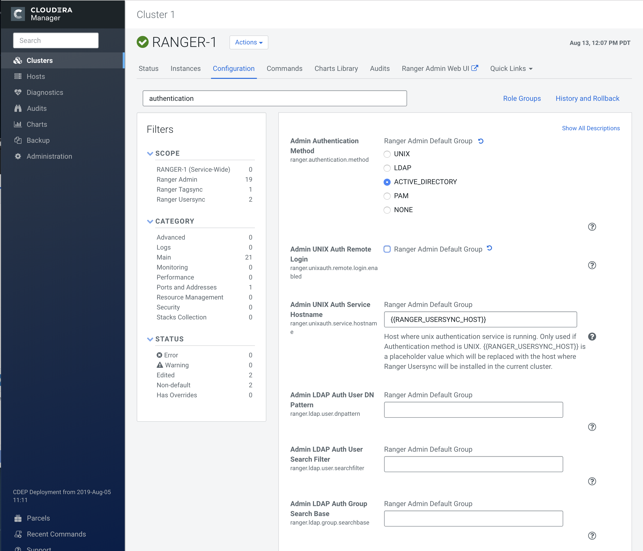 Select Cloudera Manager > Ranger > Configuration, type authentication in