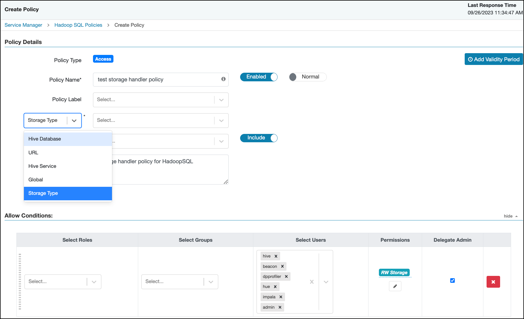 Ranger includes “storage-type” and “storage-url” resources in HadoopSQL Service that support only the “RW Storage ” permission. Ranger authorizes users to create or alter tables against this resource policy. Users are allowed to create/alter the table in the respective storage if they have the required “RW Storage” permission on the resource representing the storage-type and storage-url .