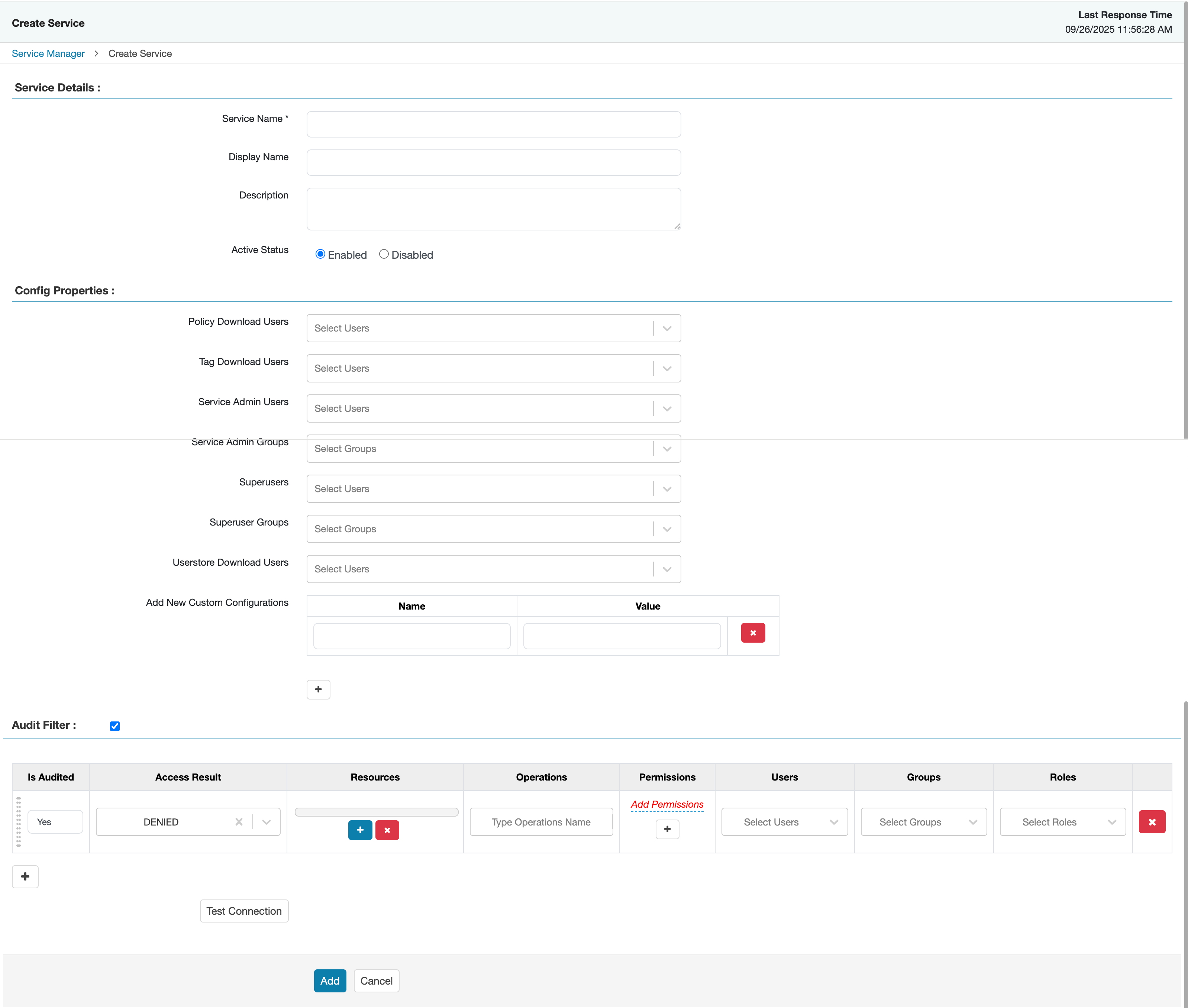 2. On Create Service, type in a service name and an optional description. The service is enabled by default, but you can disable it by selecting Disabled. To add the service, click Add.