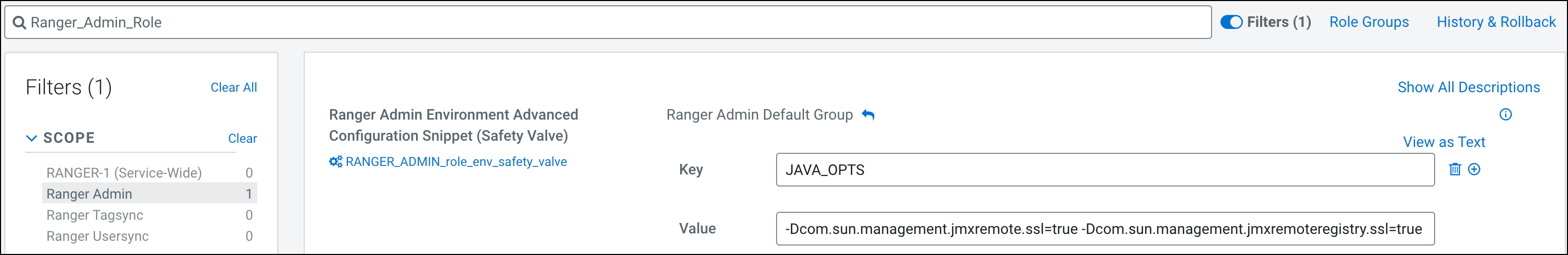 Adding key/value pairs to the Ranger Service Environment Advanced Configuration Snippet (Safety Valve) applies the values across all roles in the Ranger service except client configurations.