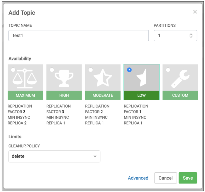 Add a topic name, select partitions, and cleanup policy.