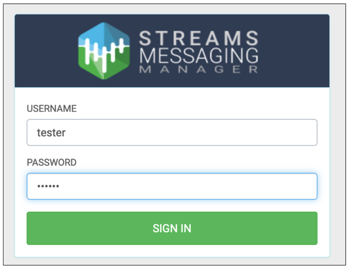 The login page for Streams Messaging Manager appears.