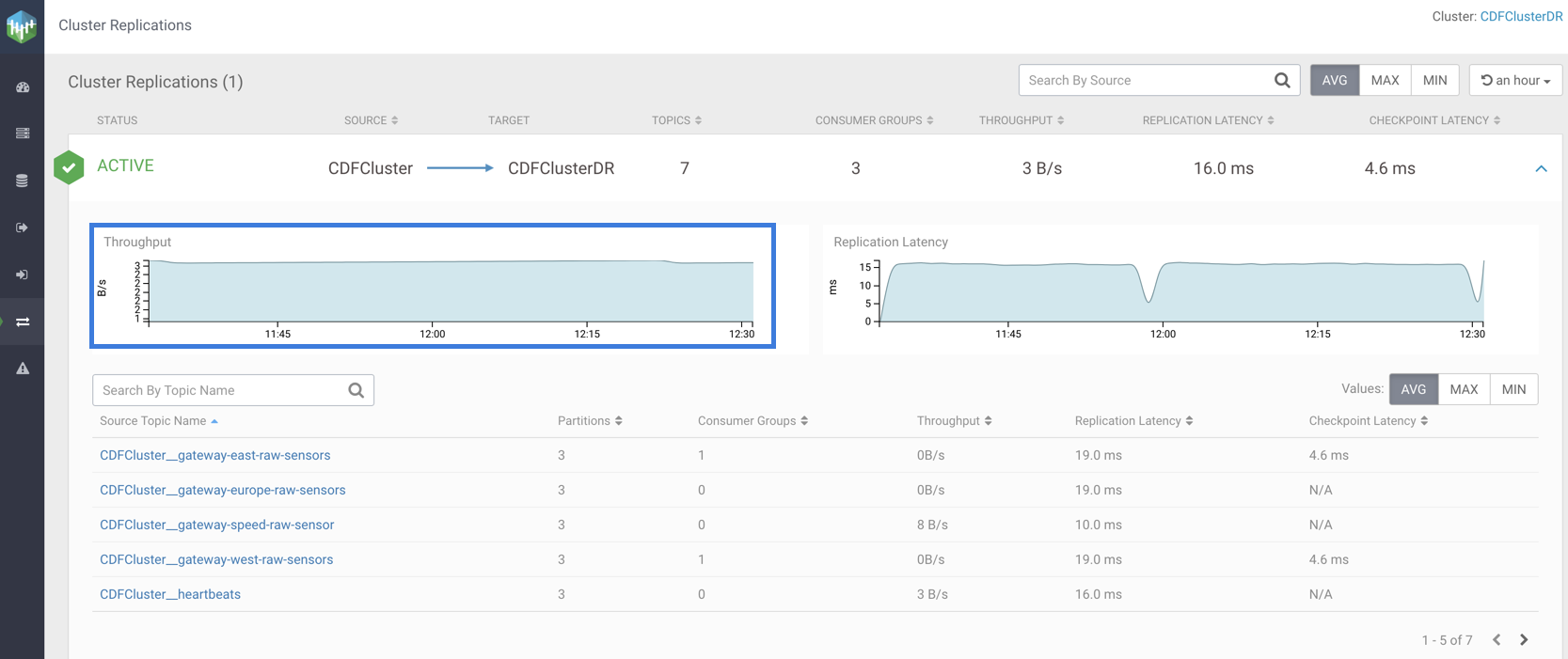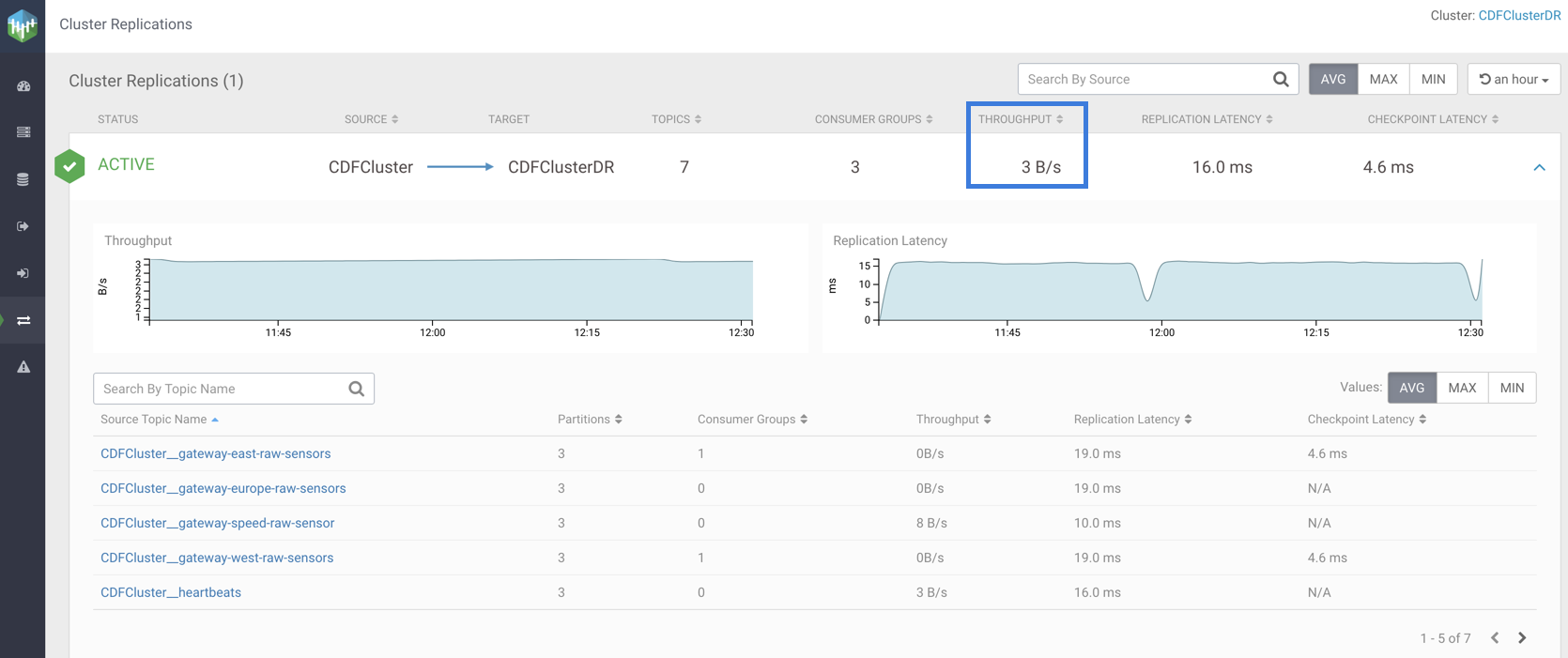 In the image, you can see the average throughput for the CDFCluster to CDFClusterDR replication