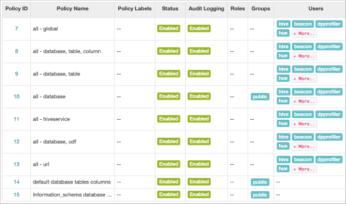 Before starting Hive for the first time, check that you are covered by Ranger policies required for basic operations as shown in the following steps. All users need to use the default database, perform operations such as listing database names, and query the information schema. The preloaded default database tables columns and information_schema database Ranger policies cover group public (all users). If these policies are disabled, you cannot use the default database, perform basic operations such as listing database names, or query the information schema. For example, if the default database tables columns policy is disabled, the following error appears if you try to use the default database: